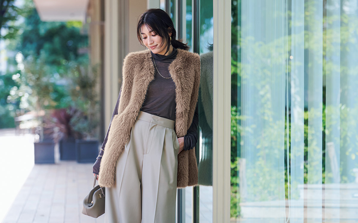 ミドル丈ジレは、パンツと合わせてもヒップまで隠してくれて、気負わず着られる。優しげなブラウンでまとめれば、ファー素材ジレにありがちな〝ハイソな印象〟も回避。