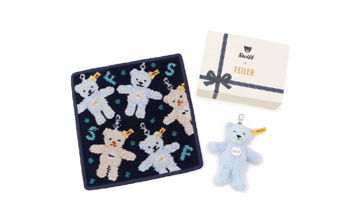 今回のコラボレーションで誕生したのは、コラボレーションのために特別に制作されたオリジナルデザインのフェイラーハンカチと、シュタイフで人気のテディベア「ベン」のソフトキーリングのスペシャルなセット。