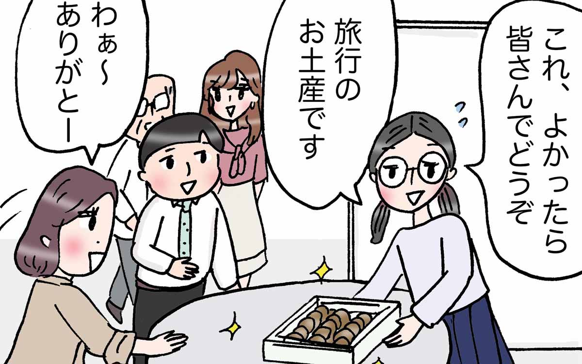 働く女性の“あるあるネタ”を4コマ漫画でお届け。人気イラストレーター・村澤綾香さんによる描き下ろしの毎週土日月の連載です。 今回のお話は、旅行のお土産。