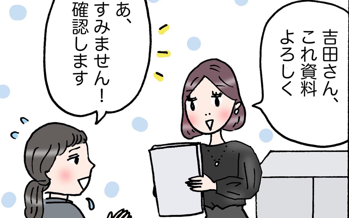 仕事中、なでし娘ちゃんから資料を受け取って、「すみません! 確認します」と吉田さん。