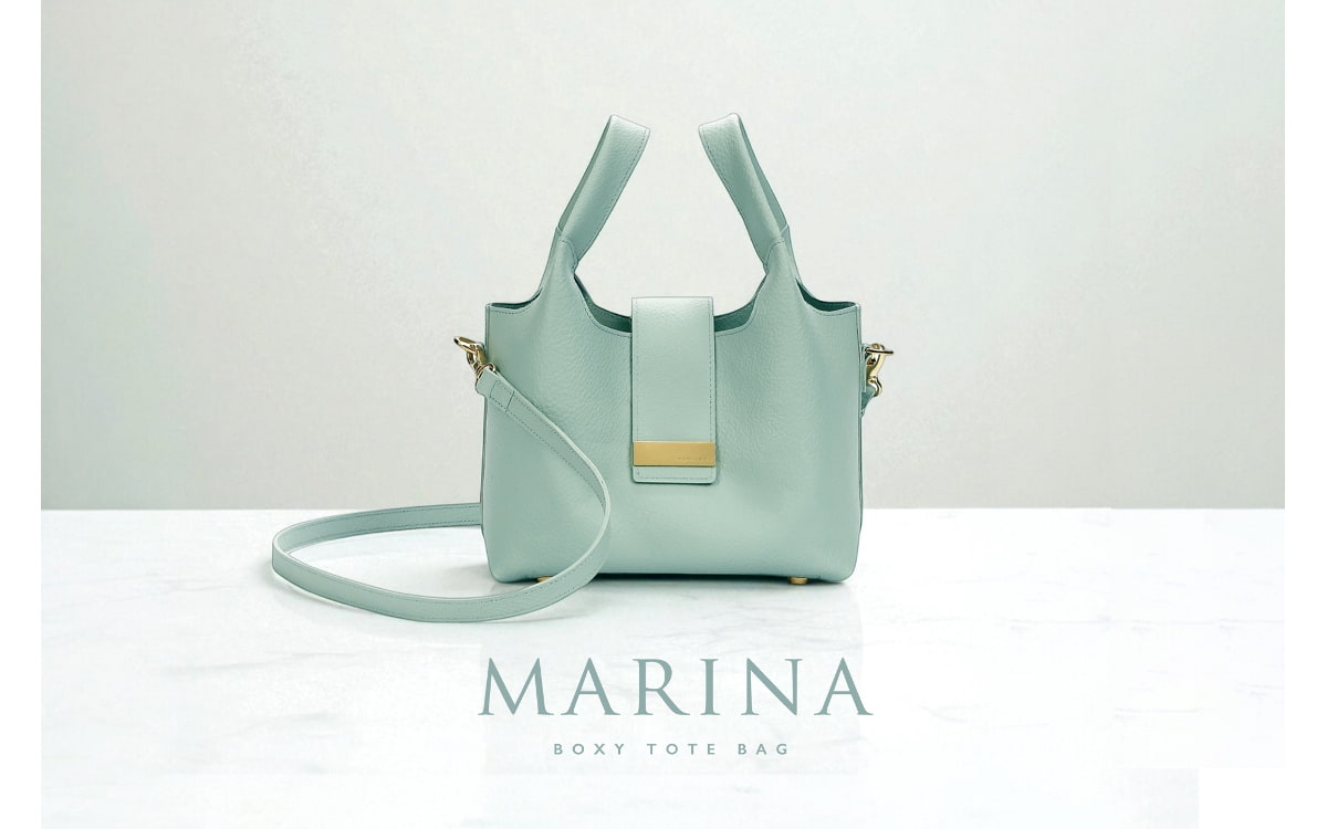 「マリーナ」は、オンオフ使えるシンプルなボックスシルエットのトートバッグ。コンパクトながらマチがしっかりあるので、ウォータボトルやコンパクトな折り畳み傘なども収納できる大容量です。