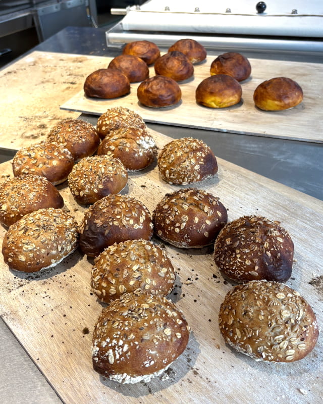 味の決め手となるのは、特別に注文して作られた天然の御影石を使った窯! 高温で一気に焼き上げることで、バンズが外は香ばしく、中はしっとり柔らかく。こだわりのオリジナルバンズは、プレーン、クラフト、ブリオッシュの3種類。ハンバーガーの具材に合わせて使い分け、パンの香りと甘みを最大限に引き出します。ベーカリー「アマム ダコタン」で培った発酵技術を活かし〝パンが主役〟とも言えるほどの完成度に仕上がっています。