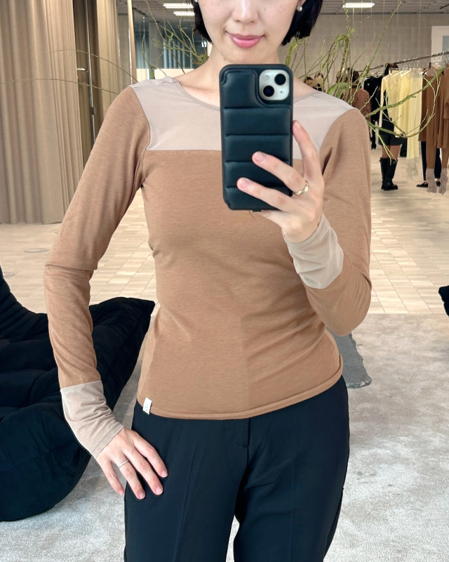 ブラウン、ブラック、クリームの3色展開。ブラウンを試着してみると、体のラインをきれいに見せてくれて着心地もよく何より温かい~! カップがついているのも忙しい朝にラクですね^^