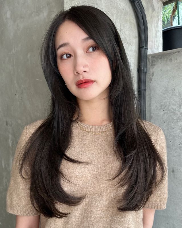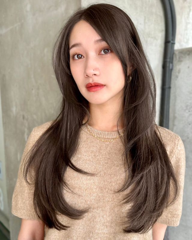 カットは胸下でベースを前上がりに切り、耳前にスライドカットでレイヤーを入れます。毛先の厚みをしっかり残しつつフロントにもレイヤーをオン。やりすぎない程よいレイヤーがカギです。前髪は長めで洗練された印象に。