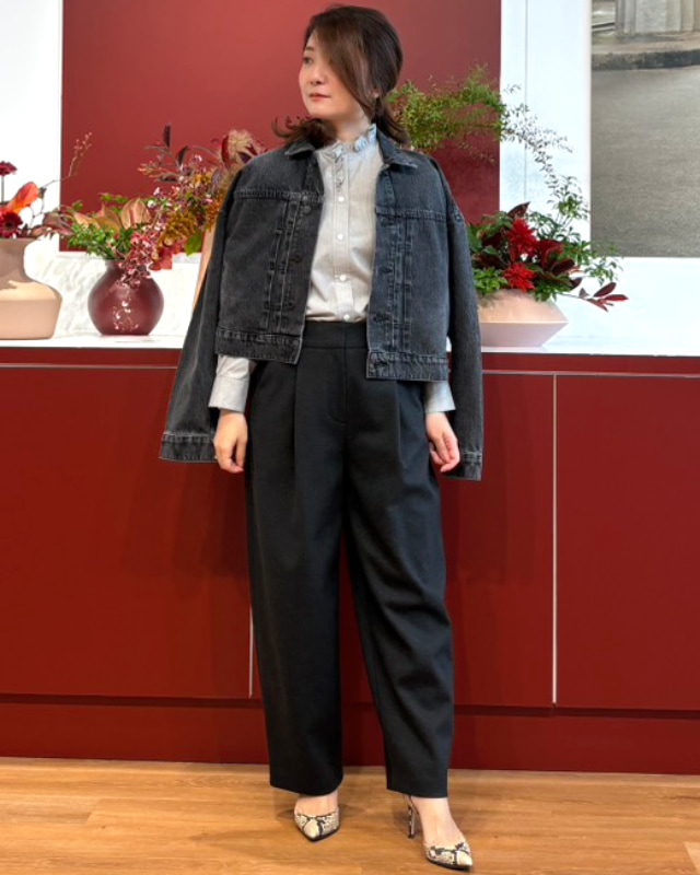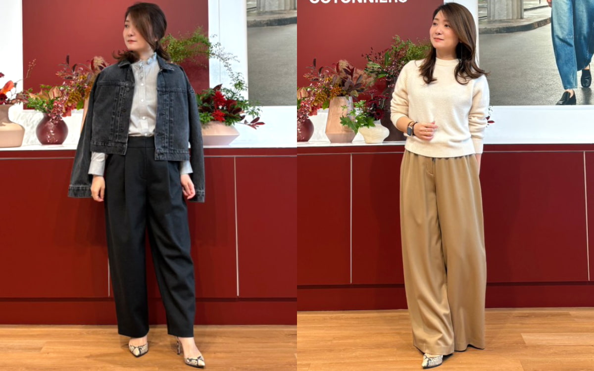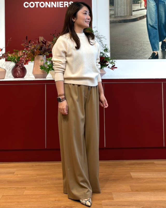 触った瞬間のふんわり感に感動したカシミヤセーター、着心地も触り心地も良くて3万円くらいしそう! と思ったのですが、16,900円というのはコスパがかなり良いと思います。サイズはS~XLまであり、ジャストサイズで着たり大きめをゆるっと着たり、ベーシックなデザインですが色々な着方で工夫できそう。柔らかくてふわふわなアイテムは着ているととっても癒やされるので、こういった贅沢な着心地の普段着を揃えて寒い季節を楽しみたいです。たっぷりした生地感が大人っぽいワイドパンツも素敵でした。ワイドパンツって大人っぽくてかっこ良い雰囲気になるので好きです。