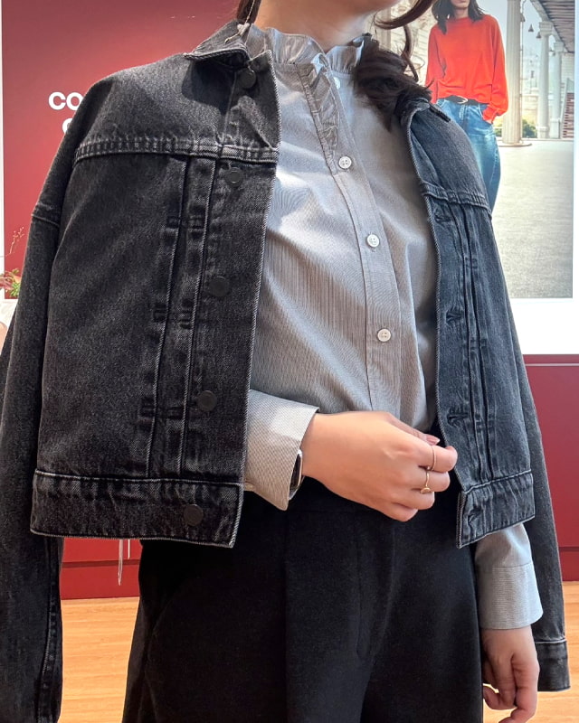 コントワー・デ・コトニエで毎シーズン定番で出ている小さなフリルがかわいいシャツ。大人かわいいってこういうこと! という素敵なデザインのシャツで、フリルですが可愛く幼くなりすぎないかな…? という心配もなく着ることができます。今回はブラックの細いストライプのシャツを着ましたが、デニム素材のものも素敵でした。