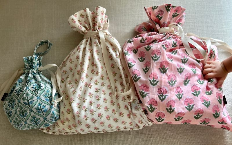 左はLサイズでバスタオルや大人の着替えも余裕で入るサイズ。右はMサイズで、主に娘の保育園のシーツやおむつを入れています。布のかわいさはもちろん、巾着の紐がサテンリボンになっているのが良いんですよね~。細部まで丁寧な作りも「好き」ポイントです。