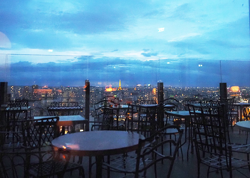 パリの夜景を思い切り楽しめるルーフトップバー、TOO TacTacへ。こちらはテラスの様子を店内から撮った様子。エッフェル塔をこんな高層から楽しめるスポットはなかなかないと思います。素敵な1日の終わりに美しい夜景を目に焼き付けて。