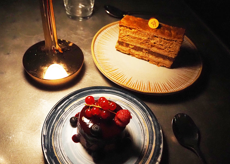 デザートも抜かりなく!パリが誇るピエールエルメのミルフィーユと、チョコレートケーキを。