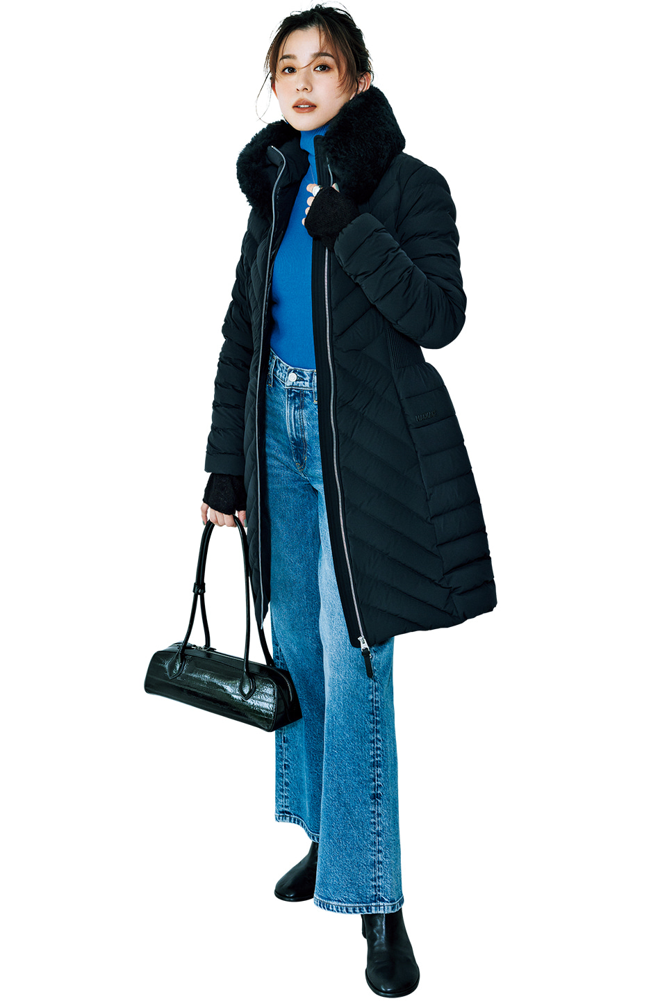 コート¥231,000(ジェイプラスインターナショナル〈マッカージュ〉) 〝ドレスレイブ〟のニット¥15,400・〝セピカ〟のバッグ¥17,380・〝ドレスレイブ/ファビオ ルスコーニ〟の靴¥47,300・〝ヴェルソー〟のニットグローブ¥6,490(ジオン商事) デニムパンツ¥16,000(Gap) リング¥19,580(ZUTTOHOLIC〈バルブス〉)