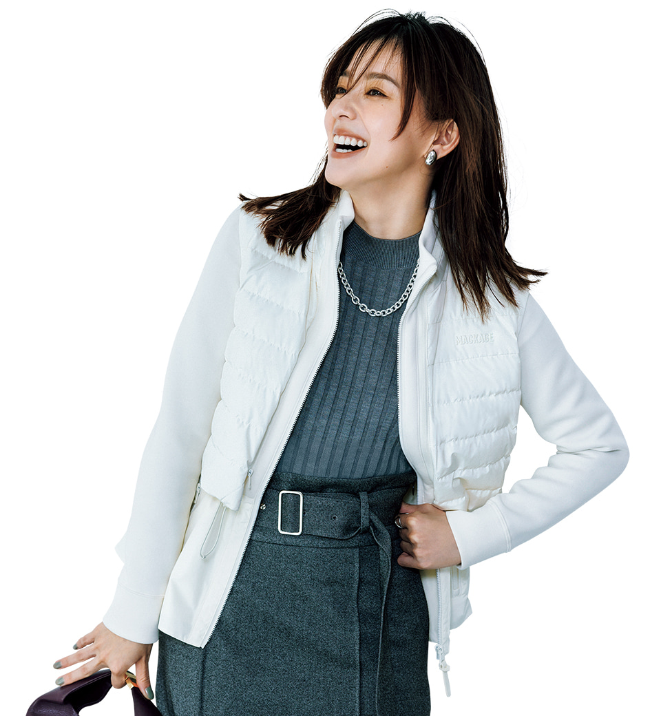 すっきりIラインの装いにウエストがふわっと広がるペプラムアウターを加えることで、フェミニンな美ラインをいっそう引き立てて。ジャケットよりも丈の短いキルティングベストが腰位置をマークしてくれるので、自然と脚が長く見えるのもうれしい。