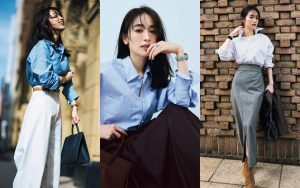 爽やかなブルーシャツは、洗練された印象を引き出すのにもってこいの一枚。柔らかい雰囲気で品よくまとめて。