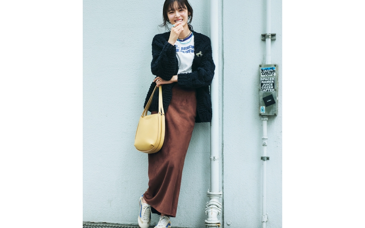 【11/1のコーデ】ロープロスニーカーのレトロムードで、いつものタイトスカートも新鮮に!