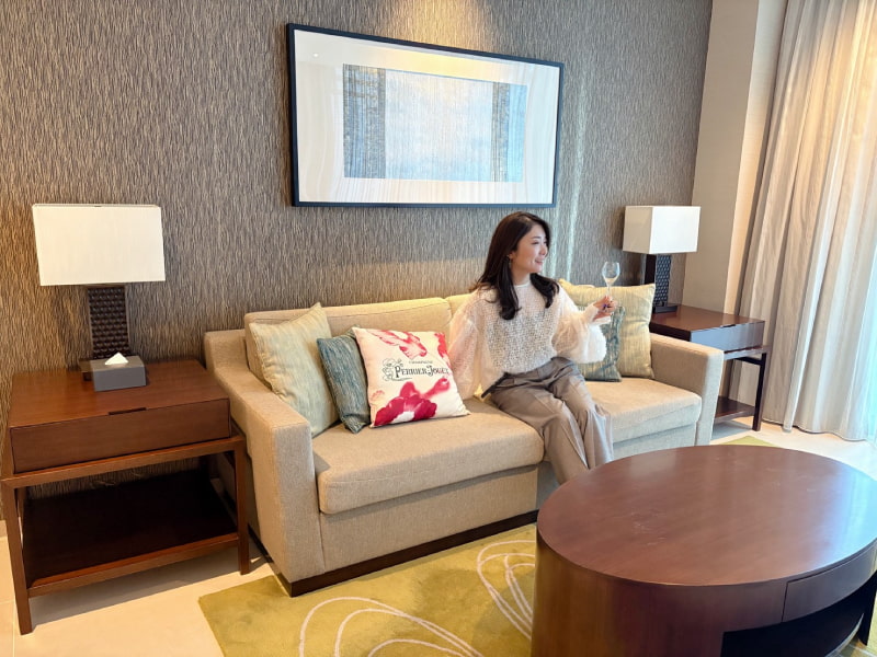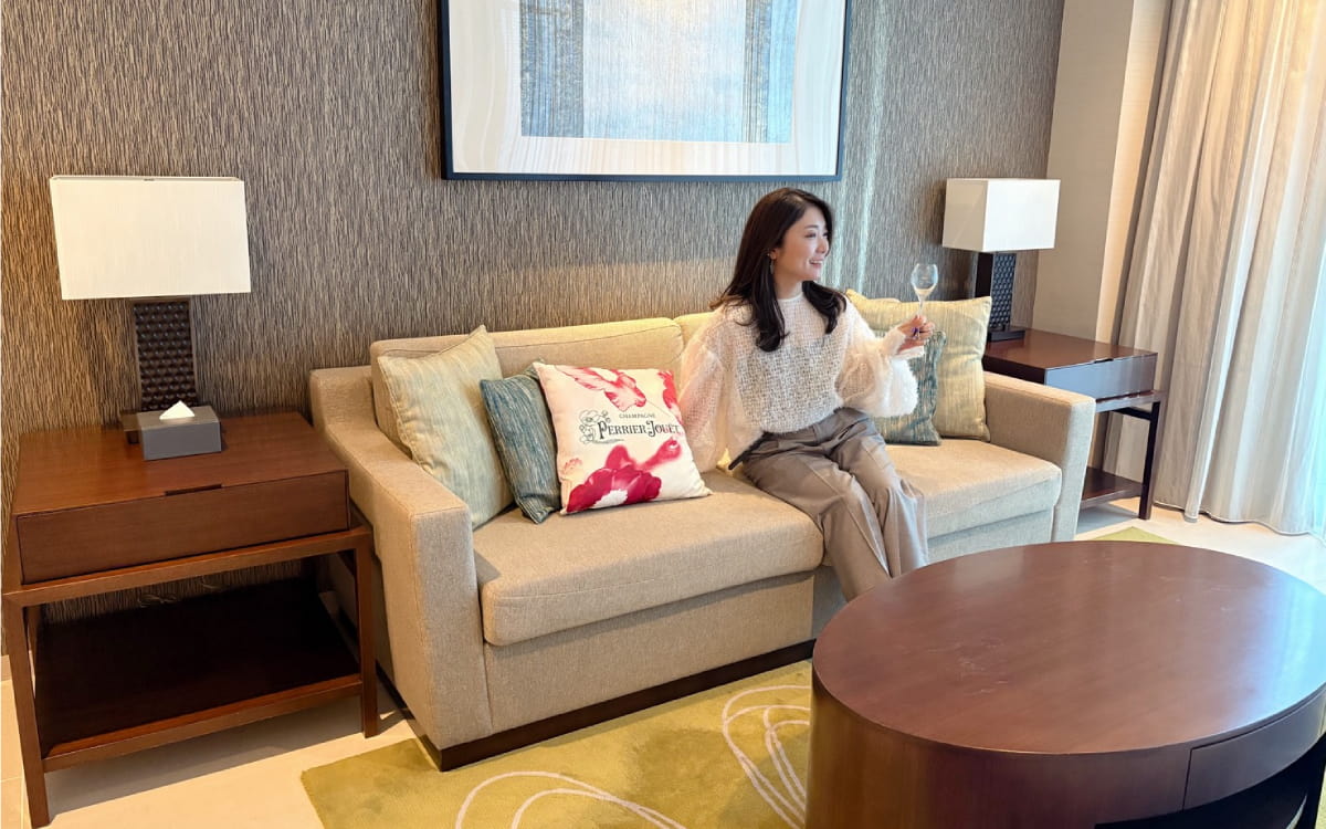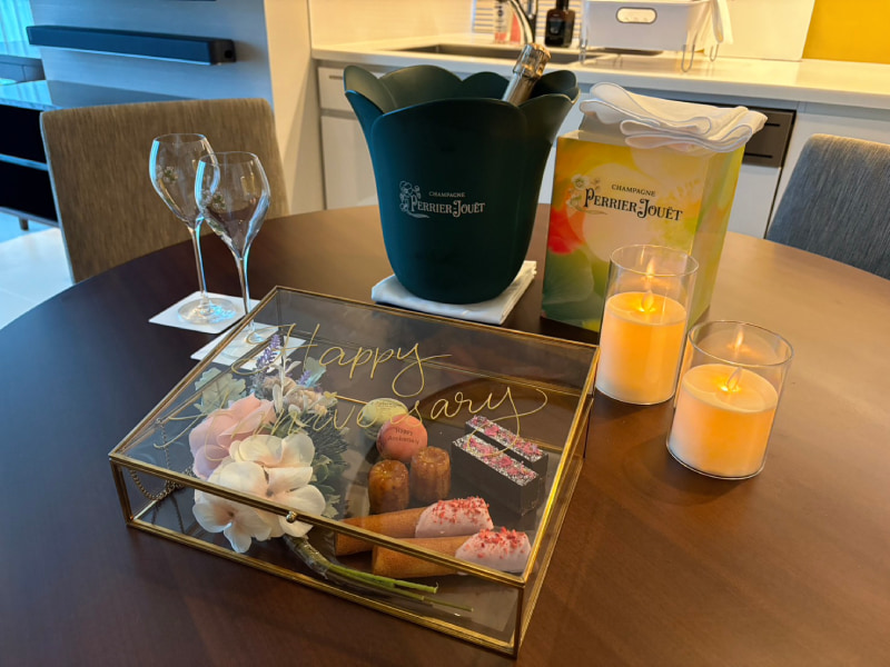 今回は、フランスの名門シャンパーニュメゾン「ペリエ ジュエ」とコラボレーションしたアニバーサリープランを体験。広い客室に仕事ができるデスクやキッチンが整っていて、ホテルだけど家のようにホッとできる空間に、シャンパンボトルとスイーツのおもてなしが。とっても素敵。