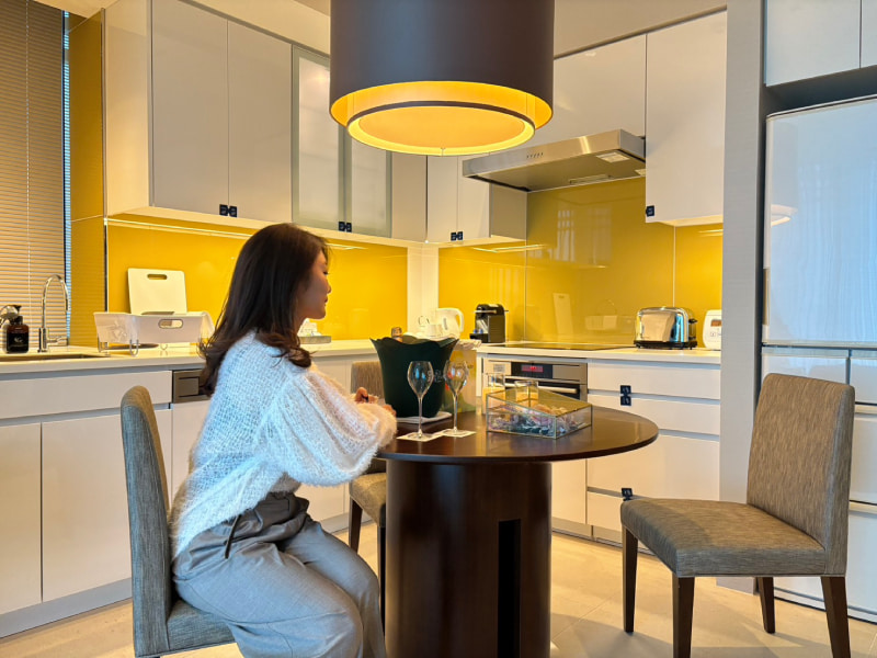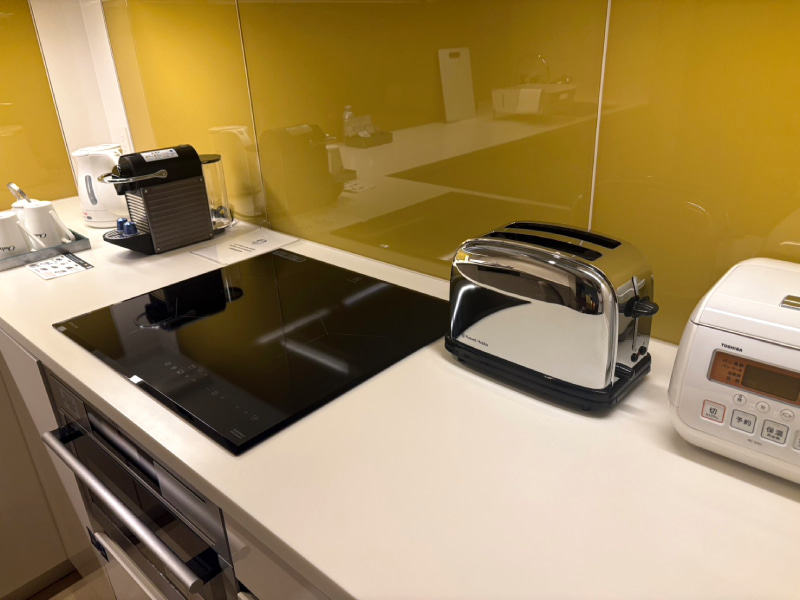 一定レベル以上のホテルによく備えられているネスプレッソマシンや電気ケトルはもちろん、IH、電子レンジ&オーブン、トースター、そしてなんと炊飯器まであるなんて…! 調理家電も食器もカトラリーもかなり充実していて、ここに数ヶ月滞在することになっても不自由なく暮らせること間違いナシ。