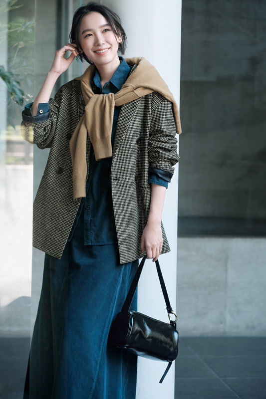 ジャケット¥132,000(オブリオ) シャツ¥63,800(エストネーション〈コラム〉) デニムパンツ¥9,900(ユナイテッドアローズ グリーンレーベル リラクシング ルミネ有楽町店〈グリーンレーベル リラクシング〉) バッグ¥143,000・チャーム¥42,900(コーチ・カスタマーサービス・ジャパン〈コーチ〉) 靴¥156,200(J.M.WESTON 青山店〈J.M.WESTON〉) ピアス¥60,500・バングル¥96,800・リング[右手]¥63,800・[左手]¥75,900(ホアキン・べラオ)