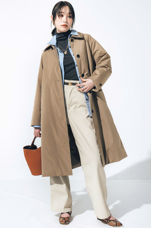 コート¥64,900(サロン アダム エ ロペ〈サロン アダム エ ロペ〉) シャツ¥2,991(アダストリア カスタマーサービス〈グローバルワーク〉) カットソー¥17,600(ティッカ) パンツ¥34,100(ロンハーマン〈RH ヴィンテージ〉) バッグ¥41,800(essence of ANAYI〈FEEL AND TASTE〉) 靴¥33,000(銀座かねまつ6丁目本店〈銀座かねまつ〉) ベルト¥14,520(T-square Press Room〈テラ〉) イヤリング¥15,400・ネックレス[チェーン]¥11,000・ネックレス[コイン]¥15,400(フーブス〈IRIS47〉)
