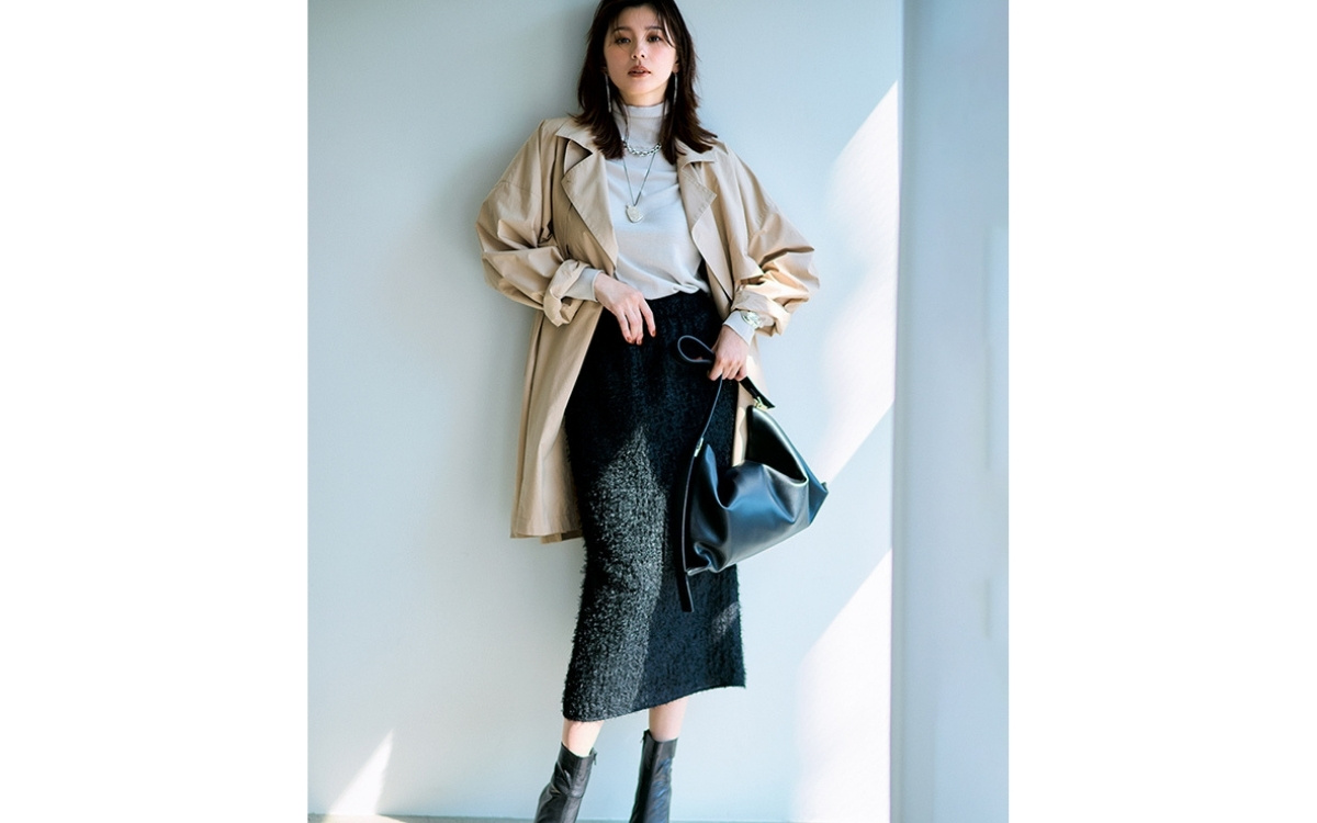 スカート¥11,990(ユナイテッドアローズ グリーンレーベル リラクシング ルミネ有楽町店〈グリーンレーベル リラクシング〉) 靴[ヒールの高さ8㎝]¥99,000(アマン〈ペリーコ〉) コート¥41,800(カデュネ) ニット¥31,900(LITTLE LEAGUE INC.〈エブール〉) 〝プンティ〟のバッグ¥49,500・〝ジャミレイ〟のバングル¥35,200(エルディスト ショールーム) ピアス¥19,250(マユコ) ネックレス[短]¥14,300(フォーティーン ショールーム〈イットアトリエ〉) ネックレス[長]¥28,600(ZUTTOHOLIC〈アドラル〉)