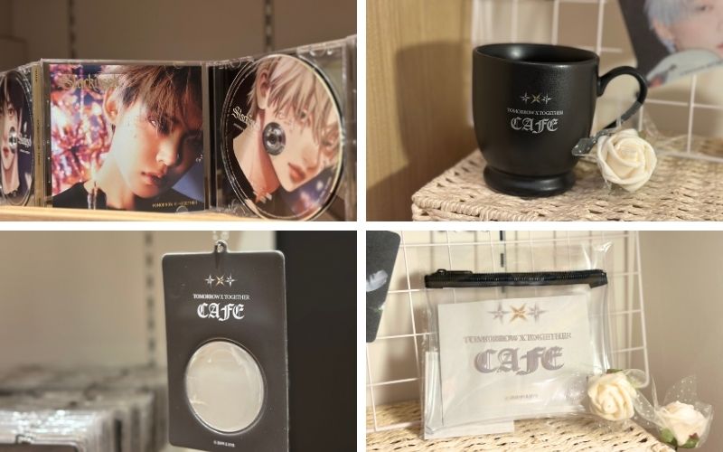 ▲左上/Starkissedのメンバーソロジャケット版が飾られていました♡ 右上/マグカップ 2,530円 左下/缶バッジケース 1,485円 右下/クリアポーチ 1,430円