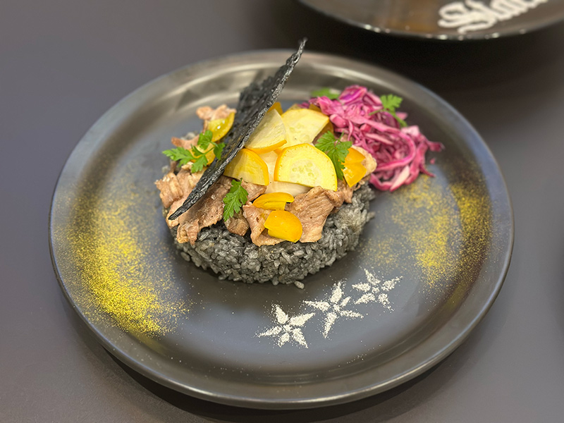 ブラックペッパーを効かせた牛肉と卵、彩り野菜をトッピングしたバター風味のフライドライス。