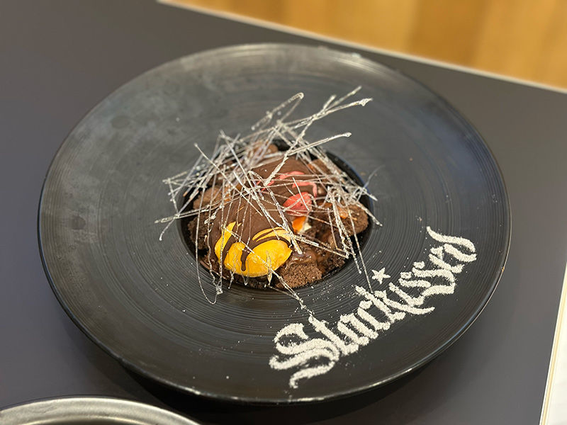 チョコブラウニーに、オレンジとフランボワーズのシャーベット、マンゴーを組み合わせたプレートパフェ。