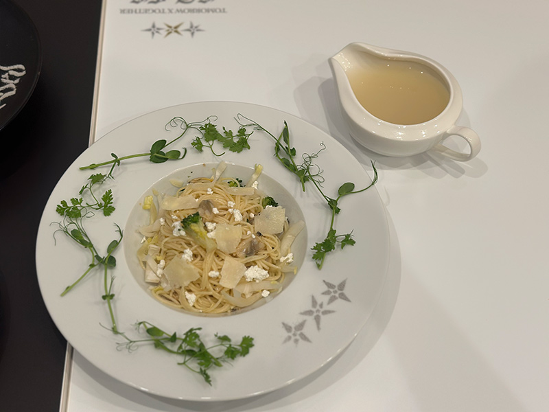2種のチーズを使用したボンゴレビアンコ。魚介のスープをかけて味わうスープパスタ。自分でスープをかけるというのも楽しいポイント。