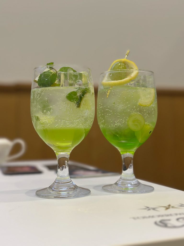グリーンアップル風味の爽やかなノンアルコールモヒート(アルコールは含まれていません/HUENINGKAI)とマスカット風味のさっぱりとしたレモンソーダ(BEOMGYU)。