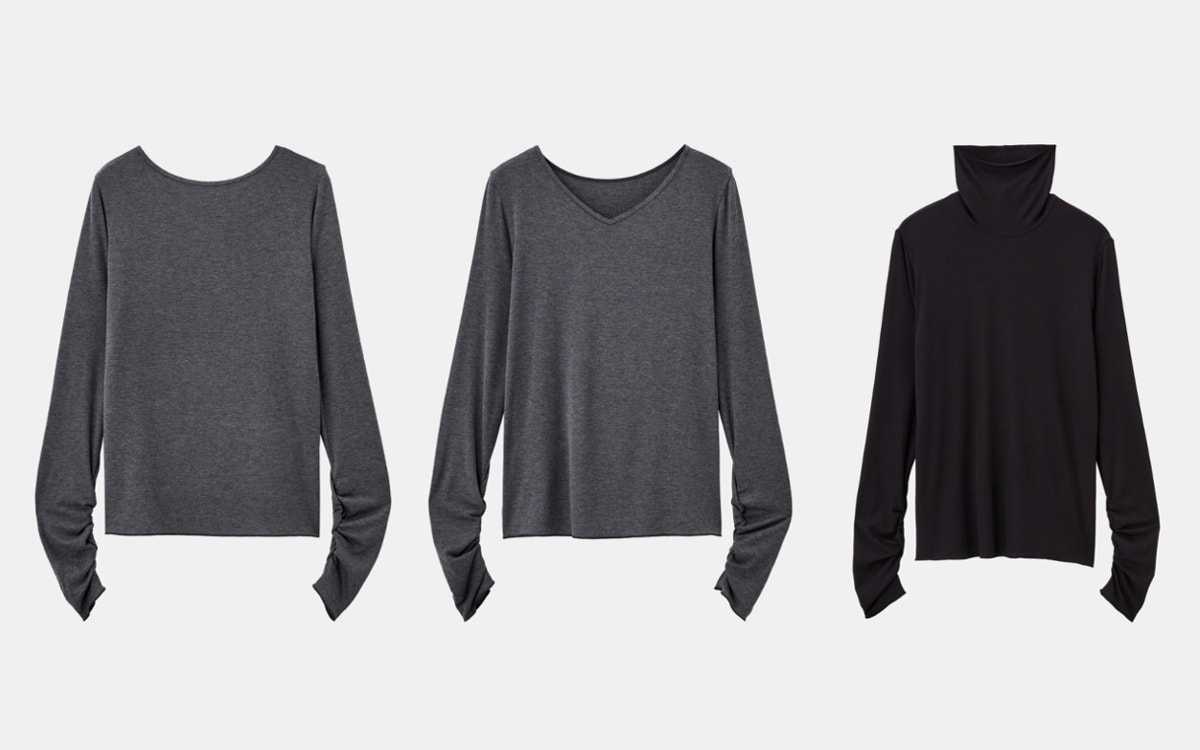繊細な糸で編み込んでいるため、ほどよい透け感と心地良い滑らかさがあり、ウルトラストレッチの機能によって体の動きに合わせてフィット。程よくゆとりのあるサイズ感やシャーリングスリーブのデザインで、1枚でもレイヤリングアイテムとしても活躍します。