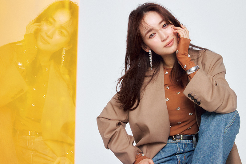 肌色になじみながらほのかに透けるトップス。そのビジューが、ジャケットのインからきらりと輝きを放つ。いつでも構えずフラットで自然体、だけどたゆまず磨き続ける心身が内側から光を放つ――。泉 里香その人を体現するような、奥ゆかしくかつ華と強度がある着こなし。