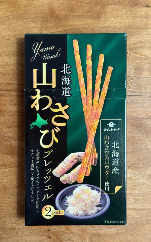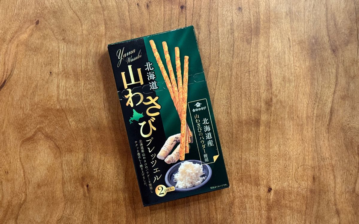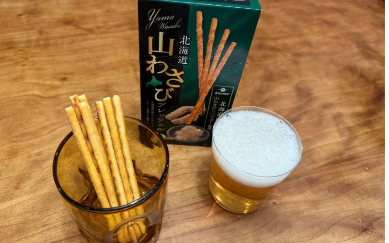 北海道出張から帰ってきた奥さんがお土産としてビールと一緒に出してくれたのが、今回ご紹介する「北海道 山わさびプレッツェル」。ちょっと太めのプレッツエルに山わさびパウダーが満遍なくかかっています。食べる前から山わさびの香りが漂っていて、「わさビーフ」などのわさび系お菓子好きとしては期待が高まります。