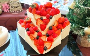 しっとりとしたアーモンド生地に、バニラの香りが口の中に広がる濃厚で滑らかなムースリーヌ、国産いちごをたっぷりサンドした贅沢で華やかなケーキです。