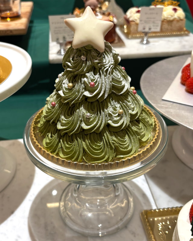 中には、しっとりチョコレートスポンジ、チョコレートムース、甘酸っぱいベリージャムを忍ばせた、見た目と味のギャップが楽しい、クリスマスツリー型のバタークリームケーキ。別添えの星型クッキーとアラザンを自分で飾って仕上げるスタイルのグリーン(抹茶は不使用)がかわいい!