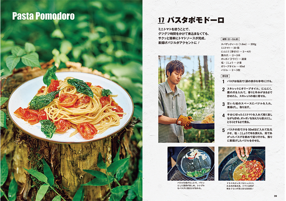 ▲速水さんおすすめメニュー:パスタポモドーロ(『最高のキャンプ飯』P38-39掲載)