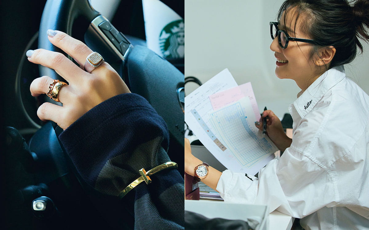 さりげない所作も映える目に留まるボリューミィな手元で仕事中の自分を鼓舞。