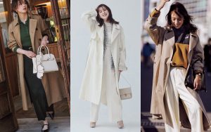 「アウターの自由度が高い内勤派は優しい色味をセレクトして通勤にふさわしい適度な華やぎを。同じくニュアンストーンの装いになじませて着れば、アウターが悪目立ちせず好印象!」(スタイリスト・川上さやかさん)