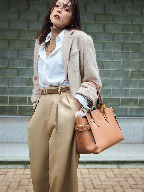 コーディネートのセンターポジションに白シャツをおくことで、それぞれ色味の異なるベージュアイテムをつなぎながら、引き立ててくれる。ジャケット¥47,300(デミルクス ビームス 新宿〈デミルクス ビームス〉) シャツ¥13,200(N.O.R.C) ニット¥29,700(Theory) パンツ¥26,400(イネド〈INÉD×NAHO MIHIROGI〉) バッグ¥195,800(ショールーム ロイト〈ザンケッティ〉) ベルト¥13,200(フラッパーズ〈レフィエ〉) ピアス¥13,750・ネックレス¥20,900(ココシュニック〈ココシュニック オンキッチュ〉)