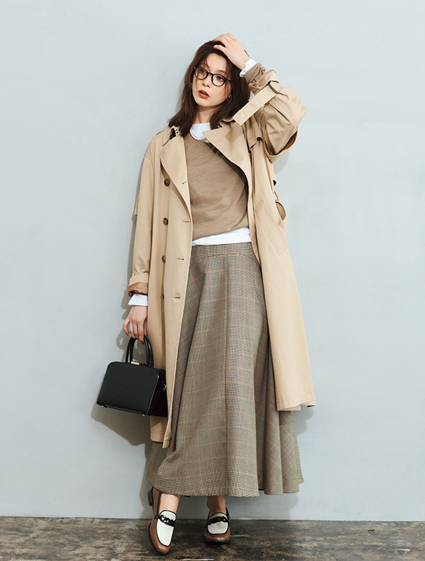 ベージュをなじませる白ロンTの3点見せが効果抜群。トレンチコート[共布ベルト付き]¥74,800(シップス インフォメーションセンター〈シップス プライマリー ネイビー レーベル〉) ニット¥38,500(エイチ ビューティー&ユース〈ロエフ〉) カットソー¥16,500(エイトン青山〈ATON〉) スカート¥66,000(ヒューエルミュージアム GINZA SIX店〈ヒューエル ミュージアム〉) バッグ¥51,700(エルディスト ショールーム〈プンティ〉) 靴¥26,400(銀座かねまつ6丁目本店〈銀座かねまつ〉) メガネ¥41,800(プロポデザイン〈プロポ〉) ネックレス¥22,000(アビステ)