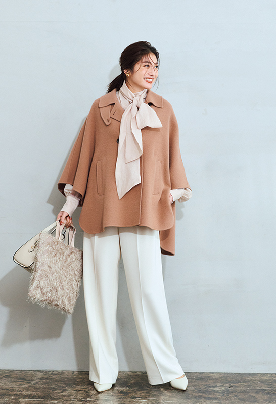 ワントーンコーデをつないでなじませることも、効かせ色としてメリハリをつけることも可能なのが白。潔い白がベージュワントーンをキリッと引き締めて、かっこよく。コート¥54,890(オンワード樫山〈23区〉) ブラウス¥25,300(ウィム ガゼット 丸の内店〈ウィム ガゼット〉) パンツ¥37,400(Theory) トートバッグ¥13,200(シャルマントサック) バッグ¥23,100(シップス インフォメーションセンター〈ミロス〉) 靴¥23,980(ユナイテッドアローズ 丸の内店〈ユナイテッドアローズ〉) イヤリング¥11,000(アビステ)