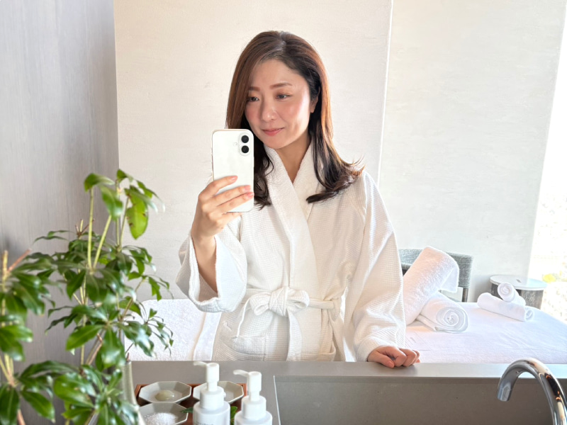 バスローブに着替えて、準備完了! フェイシャルでメイクを落とす施術もあるので、スキンケアアイテムも全てオリジナルのものが完備されていてとっても充実していました。