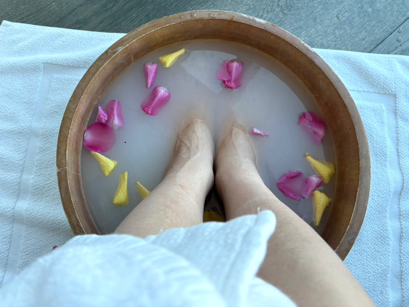 まずは足湯から。贅沢に花びらを浮かべたお湯に足を浸して、最初に選んだ香りのバスソルトでフットマッサージをしていただきます。蒟蒻でできた優しい肌当たりのバスソルトで、窓の外をぼんやり眺めながら足をマッサージしてもらう… 本当にお姫様になった気分でうっとり…♡
