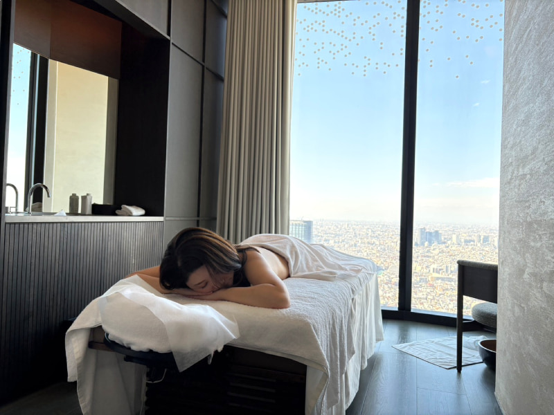 プライベートシャワー付きの個室に入ると、大きな窓から絶景が…! この日はとっても爽やかな秋晴れの日だったので、特別きれいに見えました。夕焼けや夜景も絶対に素敵。この空間でスパが体験できるなんて夢のようです。