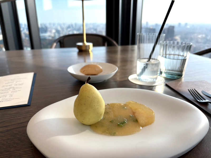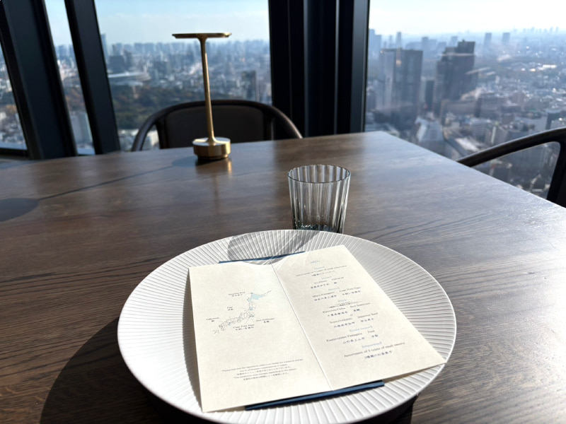 テーブルからの眺めが素敵。コースは食材で日本各地を旅するというテーマで作られていて、それぞれこだわり抜いて選ばれた食材がどこからのものなのか、丁寧に説明が書かれています。