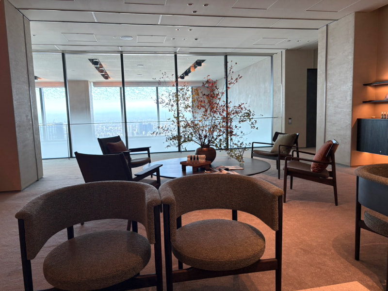 1Fの入口からエレベーターで上がるとそこはもう別世界…!「都会の喧騒から離れた」という言葉がぴったりなホテルのエントランスから、予約していたスパエリアへ。スパはホテル最上階の47階に位置していて、高層階ならではの絶景が広がっています。