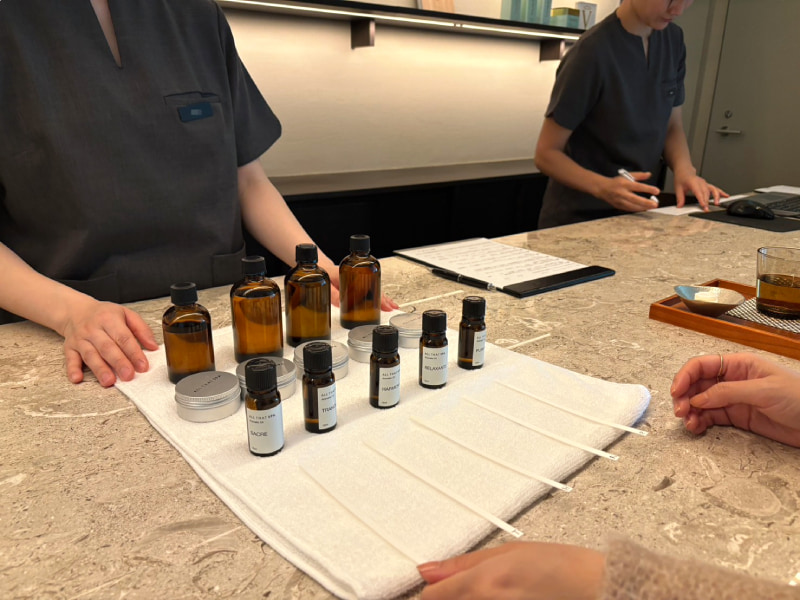 5つの香りから当日使う香りをゆっくりと吟味して選択。全て国内の産地の材料を使った香りで、どれもナチュラルで癒やされる香りでした。