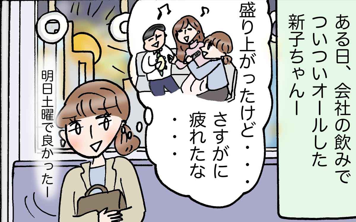 働く女性の“あるあるネタ”を4コマ漫画でお届け。人気イラストレーター・村澤綾香さんによる描き下ろしの毎週土日月の連載です。 今回のお話は、オール明けの電車での出来事。