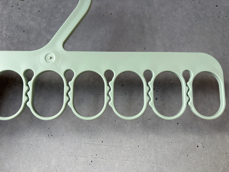 見た目以上にしっかりとした硬さがあり、想像よりも頑丈なつくり。厚みはほとんどないのに、ぐにゃっと曲がることもなく安定感があります。挟む部分の開きはやや控えめなので、薄手の靴下やインナーなど軽めの衣類を干すのにちょうどいいバランスです。