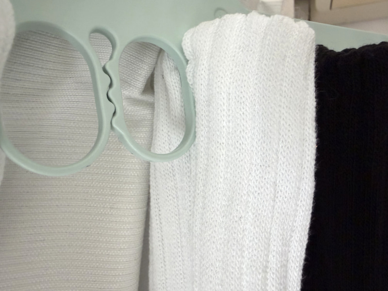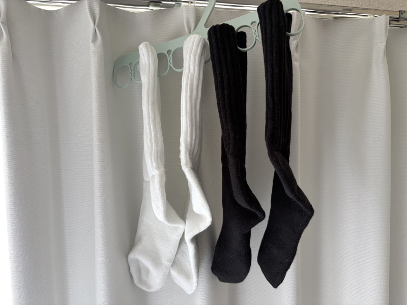 実際に靴下をかけてみると、しっかりホールドされて落ちる心配ゼロ。やや硬めのつくりなので跡は少しつくものの、その分ホールド力は抜群です。風が吹いてもズレず、乾くまで安定して干しておける安心感も◎。そして、乾いたら引っ張るだけでスッと取れるのが本当にラク!