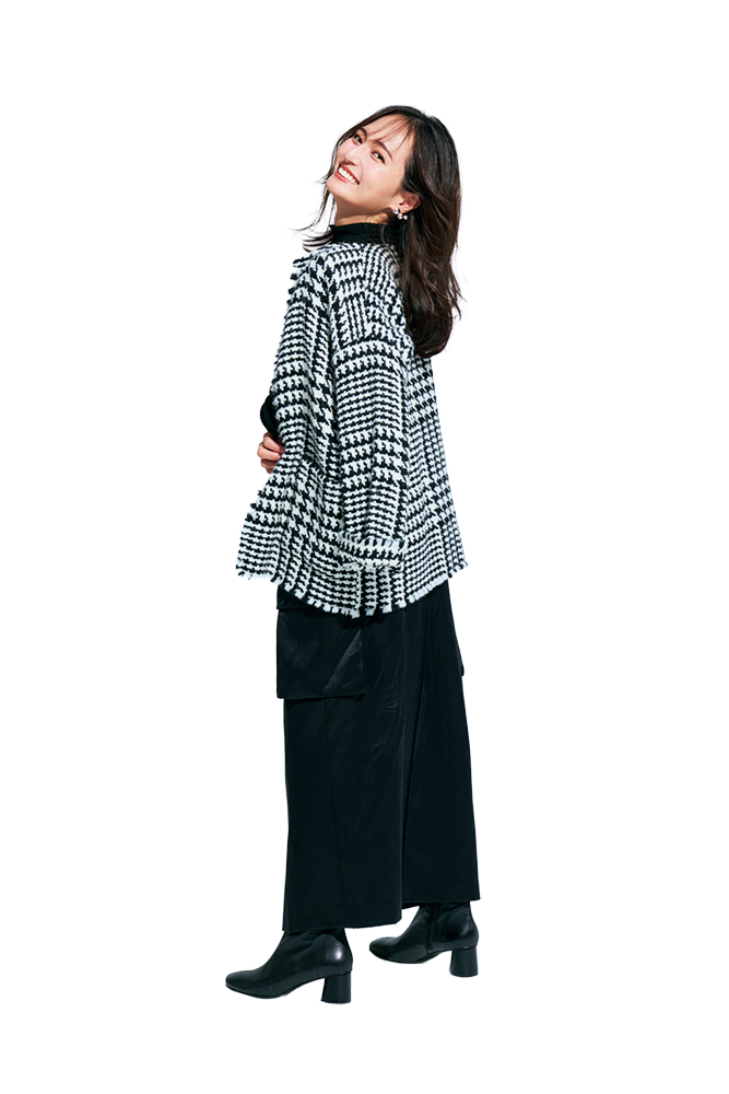 イヤリング[真鍮]各¥10,780(ソワリー) ジャケット¥27,280(リエス〈ジョン ブラニガン〉) ニット¥28,600(マルティニーク ルミネ横浜〈レリタージュ マルティニーク〉) スカート¥46,200(フィルム〈ダブルスタンダードクロージング〉) 靴¥29,700(シップス インフォメーションセンター〈マリアン〉) インナー/スタイリスト私物