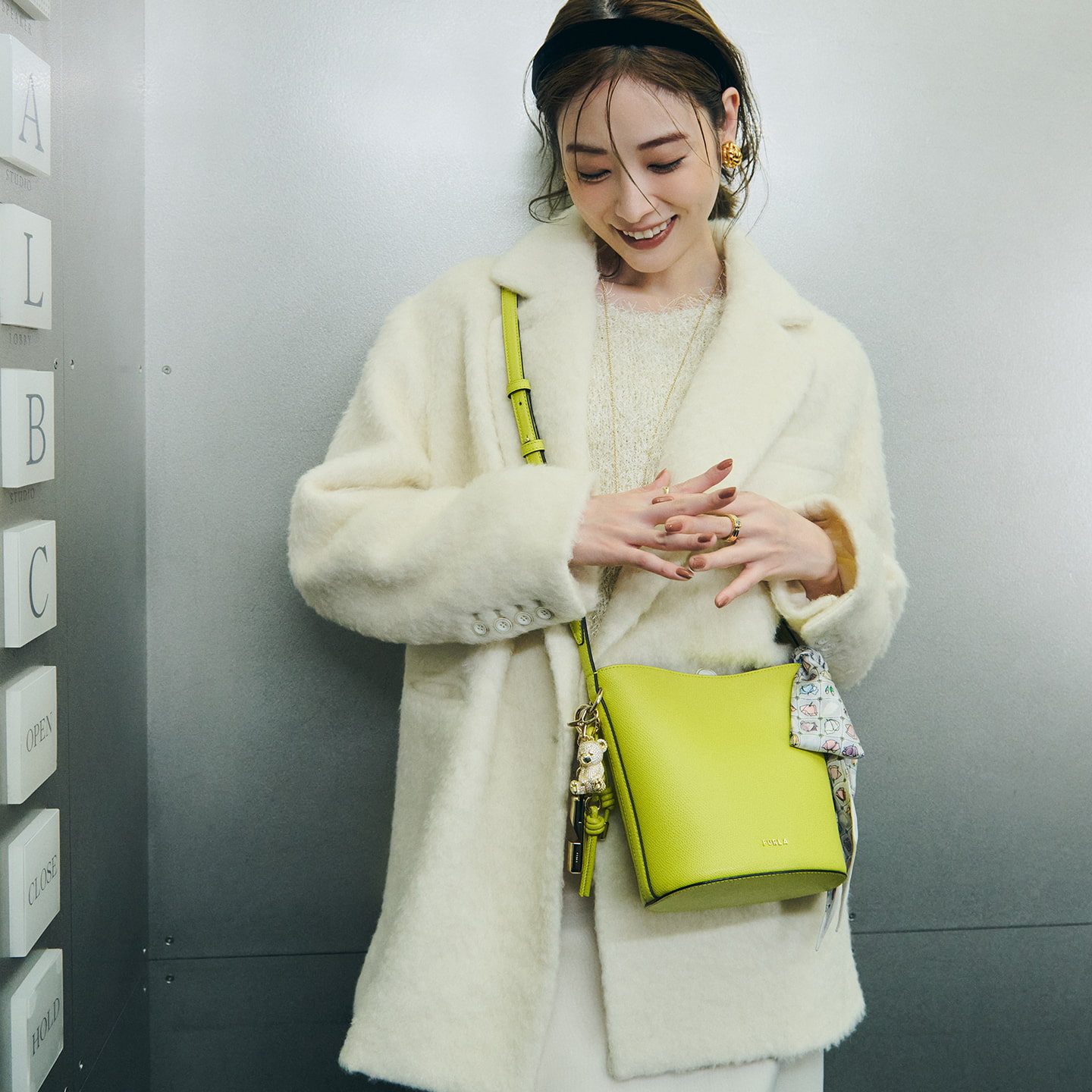 品のよさと大人の余裕を感じさせる、エグゼブティブ派の装い。ライトブルーのコートにベージュのバッグを合わせたやわらかな配色で、周囲も自分自身も心地よく。来年の干支・ホースチャームで、さりげなく旬を取り入れてアップデート! さらにスカーフをハンドルに編み込むことで、ホリデー仕様の華やぎも。