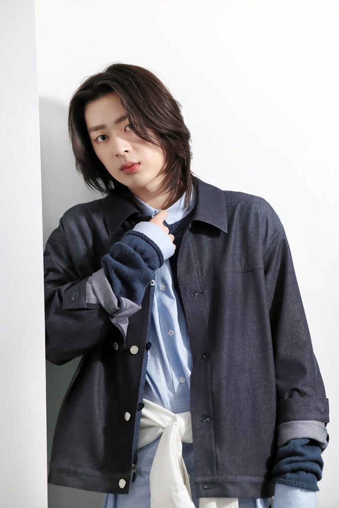 ユンギ:ジャケット¥49,500(ラファーボラ) 、シャツ¥29,700(ユナイテッド トウキョウ 神宮前店〈ユナイテッド トウキョウ〉) 、中に着たシャツ¥48,400(HEMT PR〈マナベ〉) 、パンツ¥24,200(パブリック トウキョウ カスタマーサポート〈パブリック トウキョウ〉) 、腰に巻いたカーディガン¥5,940(シアンPR〈キャスパージョン〉) 、シューズ¥31,900(シードコーポレーション〈ブランドストーン〉)